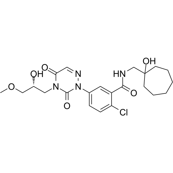 SMILESCOC[C@H](O)Cn1c(=O)cnn(-c2ccc(Cl)c(c2)C(=O)NCC2(O)CCCCCC2)c1=O