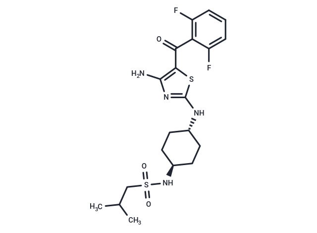 SMILESC(=O)(C=1SC(N[C@@H]2CC[C@@H](NS(CC(C)C)(=O)=O)CC2)=NC1N)C3=C(F)C=CC=C3F