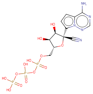In VitroIn a continuous 72 h incubation of 1 μM Remdesivir (GS-5734), the GS-443902 (GS-441524 triphosphate; Remdesivir metabolite; compound 4tp) level is measured at 2, 24, 48 and 72 h, and reaches a Cmax of 300, 110, and 90 pmol/million cells in macrophages, HMVEC, and HeLa cells lines respectively. GS-443902 (compound 8a) is a triphosphates (TP) derivative. GS-443902 (NTP; 0.01, 0.1, 1, 10, 100 μM) inhibits RSV RdRp-catalysed RNA synthesis by incorporating into the nascent viral RNA transcript and causing its premature termination. GS-5734 selectively inhibits EBOV replication by targeting its RdRp and inhibiting viral RNA synthesis following efficient intracellular conversion to GS-443902.