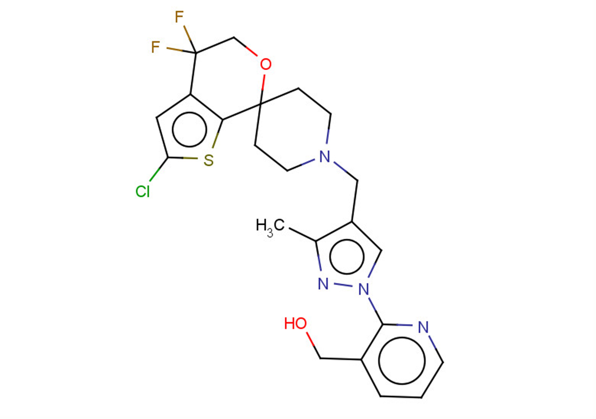 SMILESCc(c(CN(CC1)CCC1(c(s1)c2cc1Cl)OCC2(F)F)c1)nn1-c1ncccc1CO
