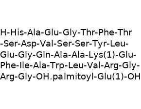 Chemical NameGlycine, L-histidyl-L-alanyl-L-alpha-glutamylglycyl-L-threonyl-L-phenylalanyl-L-threonyl-L-seryl-L-alpha-aspartyl-L-valyl-L-seryl-L-seryl-L-tyrosyl-L-leucyl-L-alpha-glutamylglycyl-L-glutaminyl-L-alanyl-L-alanyl-N6-(N-(1-oxohexadecyl)-L-gamma-glutamyl)-L-lysyl-L-alpha-glutamyl-L-phenylalanyl-L-isoleucyl-L-alanyl-L-tryptophyl-L-leucyl-L-valyl-L-arginylglycyl-L-arginyl-