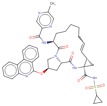 SMILESCc1ncc(nc1)C(=O)N[C@H]5CCCCCC=C[C@@H]8C[C@]8(NC(=O)[C@@H]6C[C@@H](Oc3nc4ccccc4c2ccccc23)CN6C5=O)C(=O)NS(=O)(=O)C7CC7