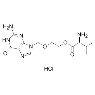 DescriptionAn antiviral agent that acts as a very potent inhibitor of viral DNA polymerase; a prodrug of aciclovir for management of herpes simplex (HSV), herpes zoster and herpes B infection.HSV Infection Approved(In Vitro):Valacyclovir hydrochloride (Valaciclovir hydrochloride; VACV) uptake was concentration dependent and saturable with a Michaelis-Menten constant and maximum velocity of 1.64 mM and 23.34 nmol/mg protein/5 min, respectively. A very similar Km value was obtained in hPEPT1/CHO cells and in rat and rabbit tissues and Caco-2 cells, suggesting that hPEPT1 dominates the intestinal transport properties of VACV in vitro.(In Vivo):For treatment of a first episode of genital herpes, a large comparative trial has shown that Valacyclovir hydrochloride (1 g twice a day) is as effective as acyclovir (200 mg five times a day) when given for 10 days. For treating recurrences, two trials show that valacyclovir is as effective as acyclovir (200 mg five times a day) with a treatment period of 5 days. A daily dose of 1 g of valacyclovir is as effective as 2 g daily. Valacyclovir can be administered once a day.The concentrations of acyclovir in serum and CSF were measured at steady state after 6 days of oral treatment with 1,000 mg of valacyclovir three times a day.EC50 values of PE and AC in 3T3 cells were 0.02 and 0.01 ug/ml, while values in BHK cells were 0.2 and 0.03 ug/ml. Treatment of infected immunosuppressed mice and FA and VA (b.i.d., 5.5 days) reduced the proportion with erythema from 100% to 24% and 38%, and eliminated ear paralysis, ear lesions (vesicles, etc) and death. Virus was absent from ear and brainstem by day 6, but reappeared after discontinuation in mice treated with VA.
