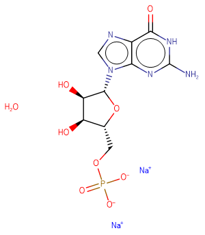 SMILESO.[Na+].[Na+].Nc1nc2n(cnc2c(=O)[nH]1)[C@@H]1O[C@H](COP([O-])([O-])=O)[C@@H](O)[C@H]1O