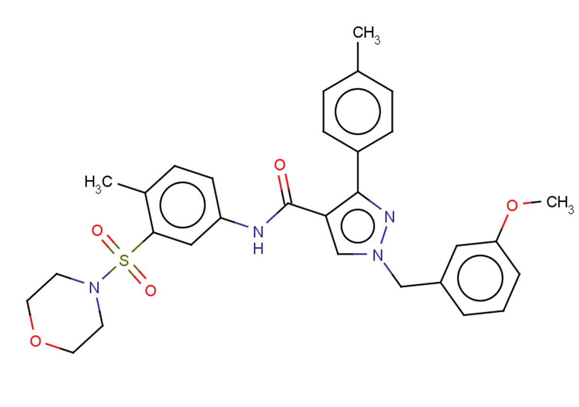 SMILESCc(cc1)ccc1-c1nn(Cc2cc(OC)ccc2)cc1C(Nc1cc(S(N2CCOCC2)(=O)=O)c(C)cc1)=O