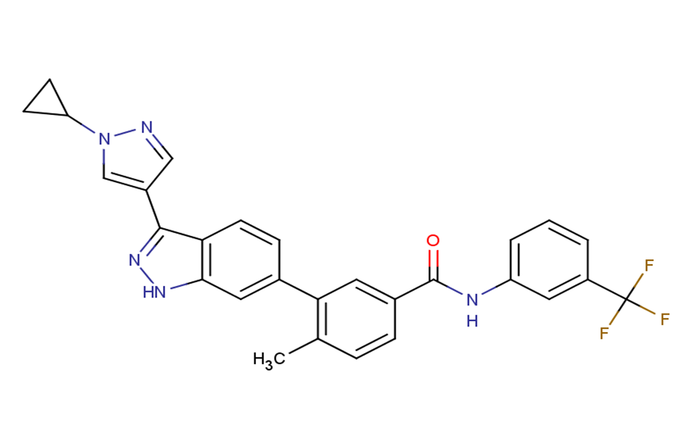 SMILESCC1=C(C=C(C=C1)C(=O)NC2=CC=CC(=C2)C(F)(F)F)C3=CC4=C(C=C3)C(=NN4)C5=CN(N=C5)C6CC6