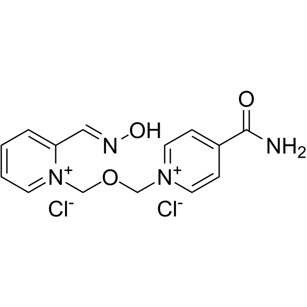 DescriptionAsoxime dichloride (HI-6) is an antagonist to acetylcholine receptors (AChRs) including the nicotinic receptor, α7 nAChR. Asoxime dichloride (HI-6) can be used as an antigen and improves vaccination efficacy in the nervous system. Asoxime dichloride involves in modulating immunity response.(In Vivo):A combination of HI-6 and keyhole limpet hemocyanin (KLH) produces a vaccination of almost the same efficacy as that for Freund's complete adjuvant. Asoxime dichloride (intramuscular injection into the rear limb; 2% and 0.2% of median lethal dose 15.6 and 1.56 mg/kg; 21 or 65 days) significantly improved vaccination efficacy as a dose-dependent manner when KLH is 1 mg/kg.