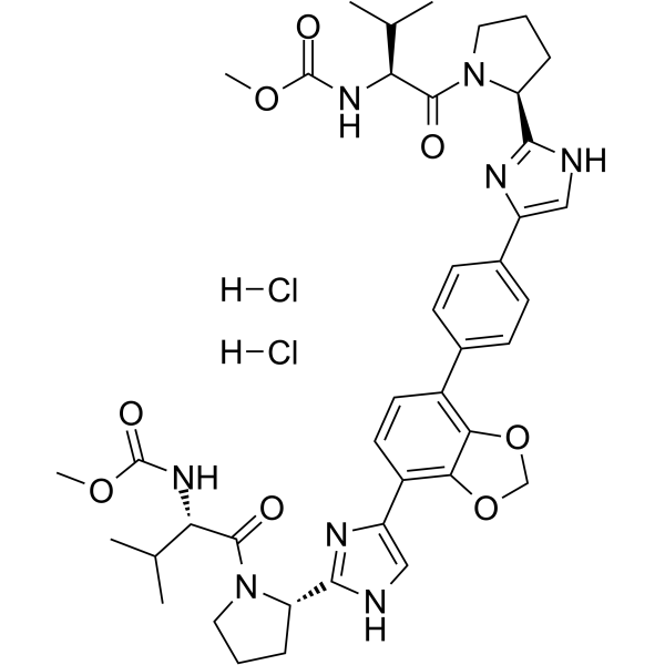 SMILESO=C(OC)N[C@@H](C(N1[C@@H](C2=NC=C(C3=CC=C(C4=C5OCOC5=C(C6=CN=C([C@H]7N(C([C@@H](NC(OC)=O)C(C)C)=O)CCC7)N6)C=C4)C=C3)N2)CCC1)=O)C(C)C.[H]Cl.[H]Cl