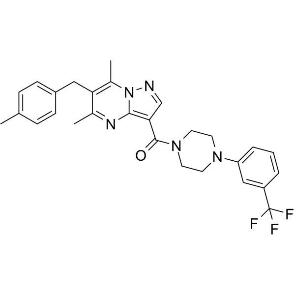 SMILESO=C(C1=C2N=C(C)C(CC3=CC=C(C)C=C3)=C(C)N2N=C1)N4CCN(C5=CC=CC(C(F)(F)F)=C5)CC4