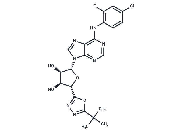 SMILESO[C@H]1[C@H](N2C=3C(N=C2)=C(NC4=C(F)C=C(Cl)C=C4)N=CN3)O[C@@H]([C@H]1O)C=5OC(C(C)(C)C)=NN5