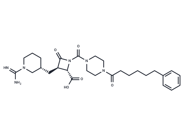 SMILESC(=O)(N1[C@H](C(O)=O)[C@@H](C[C@@H]2CN(C(=N)N)CCC2)C1=O)N3CCN(C(CCCCCC4=CC=CC=C4)=O)CC3