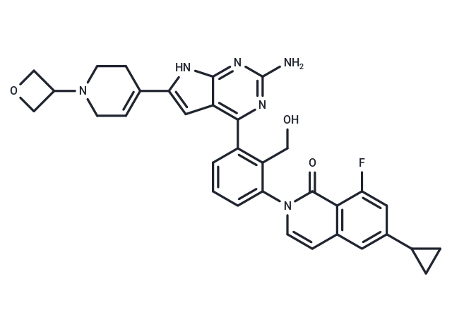 SMILESO=C1C=2C(F)=CC(=CC2C=CN1C3=CC=CC(C=4N=C(N=C5NC(=CC54)C6=CCN(CC6)C7COC7)N)=C3CO)C8CC8
