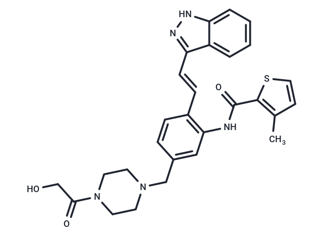 SMILESC(=C/C1=C(NC(=O)C=2SC=CC2C)C=C(CN3CCN(C(CO)=O)CC3)C=C1)\C=4C=5C(NN4)=CC=CC5