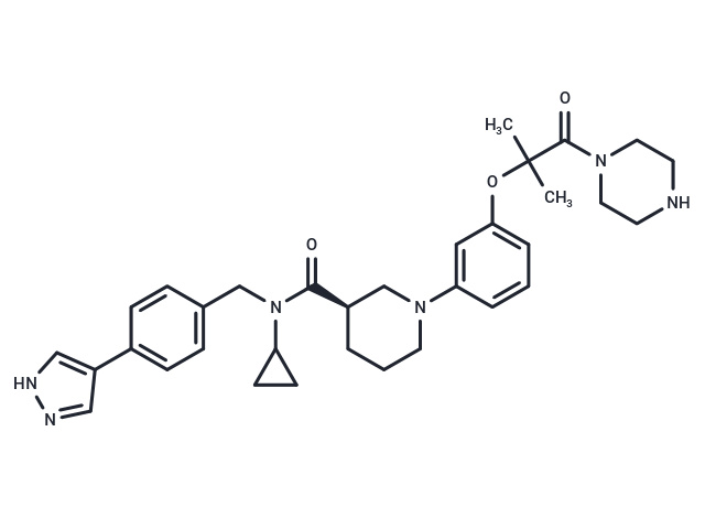 SMILESCC(C)(Oc1cccc(c1)N1CCC[C@H](C1)C(=O)N(Cc1ccc(cc1)-c1cn[nH]c1)C1CC1)C(=O)N1CCNCC1