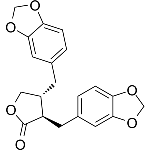 Description(-)-Hinokinin has anti-genotoxic and anticarcinogenic potential. (-)-Hinokinin is an anti-chagasic drug, has no mutagenic effects in animal cell and bacterial systems, anxiety that target the DAT, NET, and GAT-1 transporters, it may serve as a tool to develop new therapeutic drugs for attention deficit hyperactivity disorder.