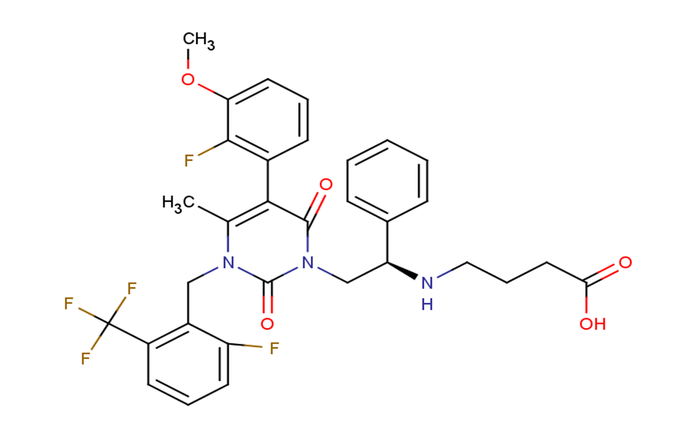 Description(R)-Elagolix is a short-acting, nonpeptide, GnRH antagonist with an IC50 and Ki of 0.25 and 3.7 nM, respectively.?administered orally, that unlike injectable depot GnRH agonists and antagonists, produces a dose-dependent suppression of ovarian estrogen production, that is, from partial suppression at lower doses to full suppression at higher doses.