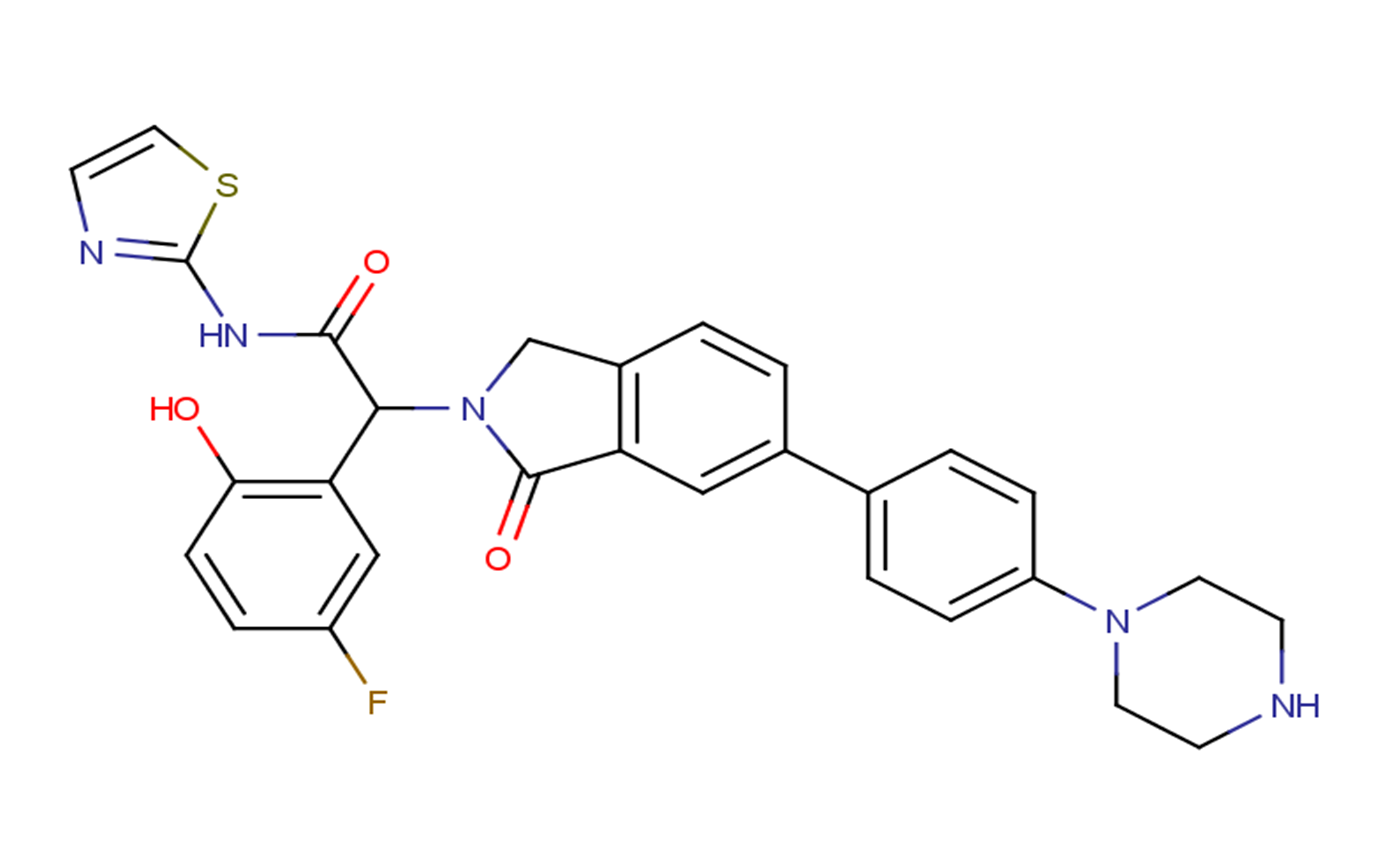 SMILESC1CN(CCN1)C2=CC=C(C=C2)C3=CC4=C(CN(C4=O)C(C5=C(C=CC(=C5)F)O)C(=O)NC6=NC=CS6)C=C3