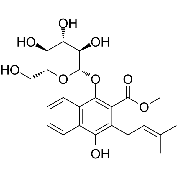 In Vitro1,4-Dihydroxy-2-carbomethoxy-3-prenylnaphthalene-1-O-β-D-glucopyranoside has no inhibitory of DNA topoisomerases I and II. 1,4-Dihydroxy-2-carbomethoxy-3-prenylnaphthalene-1-O-β-D-glucopyranoside has no cytotoxicity with A549, SK?OV?3, HepG2, and HT-29 cell lines (all of IC50>100 uM).