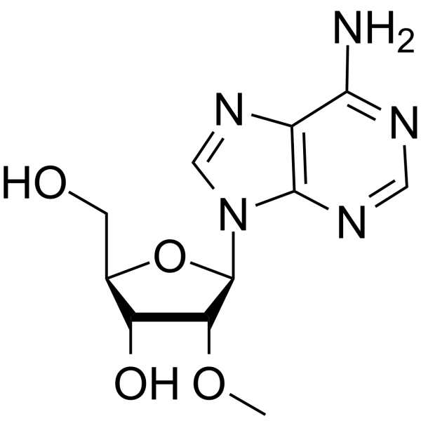 In Vivo2'-O-Methyladenosine (100, 200 mg/kg, ip, single dose) exhibits unique hypotensive activities in rats. Animal Model:Male spontaneously hypertensive rats (SHR; 16 weeks old).Dosage:100, 200 mg/kg.Administration:IP, single dose.Result:Exhibited a significant hypotensive effect in decreasing blood pressure by about 40-50%.