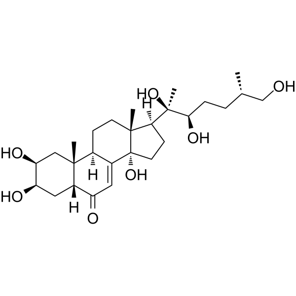 In Vitro25S-Inokosterone (10 μM) significantly promotes the proliferation of LPS-induced NRK52e cells (1.0 μg/mL LPS). 25S-Inokosterone significantly reduces the rate of NRK52e cells apoptosis. 25S-Inokosterone shows weak inhibitory activity for thymus and activation-regulated chemokine expression levels in TNF-α plus IFN-γ induced HaCaT cells. 25S-Inokosterone exhibits the most potent inhibition (80-95% at 200 μg/mL) against TNF-α expression levels in A23187 plus phorbol-myrisrate acetate-induced RBL-2H3 cells.