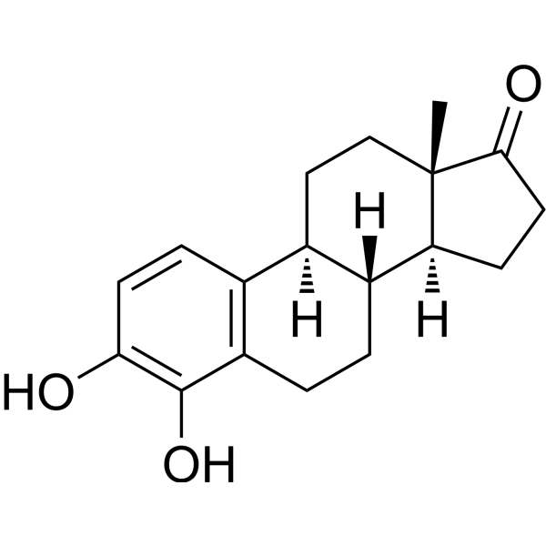 Description4-Hydroxyestrone, an endogenous estrogen metabolite, can strongly protect neuronal cells against oxidative damage.(In Vitro):Using immortalized mouse hippocampal neuronal cells as an in vitro model, 4-Hydroxyestrone, an estrone metabolite with little estrogenic activity, is found to have the strongest neuroprotective effect against oxidative neurotoxicity among 25 endogenous estrogen metabolites tested, and its protective effect is stronger than 17β-estradiol. Similarly, 4-Hydroxyestrone also exerts a stronger protective effect than 17β-estradiol against kanic acid-induced hippocampal oxidative damage in rats.(In Vivo):4-Hydroxyestrone also exerts a stronger protective effect than 17β-estradiol against kanic acid-induced hippocampal oxidative damage in rats. Neuroprotection by 4-hydroxyestrone involves increased cytoplasmic translocation of p53 resulting from SIRT1-mediated deacetylation of p53. Analysis of brain microsomal enzymes shows that estrogen 4-hydroxylation is the main metabolic pathway in the central nervous system.
