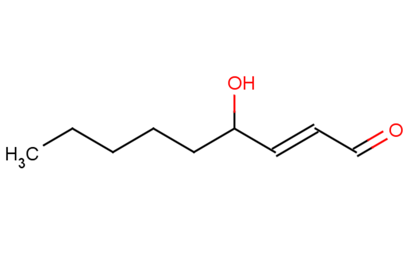 In Vitro4-Hydroxynonenal is both a substrate and an inhibitor of ALDH2; inhibition of ALDH2 by 4-Hydroxynonenal is reversible at low concentration and become irreversible when the concentration of 4-HNE reaches 10 μM.4-Hydroxynonenal can induce antioxidant defense mechanisms to restrain its own production and to enhance the cellular protection against oxidative stress.4-Hydroxynonenal, the product of lipid peroxidation, is mutagenic and genotoxic in viruses, bacteria and mammalian cells. It reacts with all four DNA bases but with different efficiency: G >C > A >T. 4-Hydroxynonenal-dG represents the best biomarker of the genotoxic effects of 4-Hydroxynonenal and these adducts are primarily found in nuclear DNA. A classic example of etiological relevance of 4-Hydroxynonenal-dG in human cancers is 4-Hydroxynonenal-dG induced p53 mutation. 4-Hydroxynonenal-dG adducts were preferentially formed at the third base of codon 249 in the p53 gene, causing gene mutation and affecting diverse biological processes including cell cycle arrest, apoptosis, DNA repair, and differentiation.
