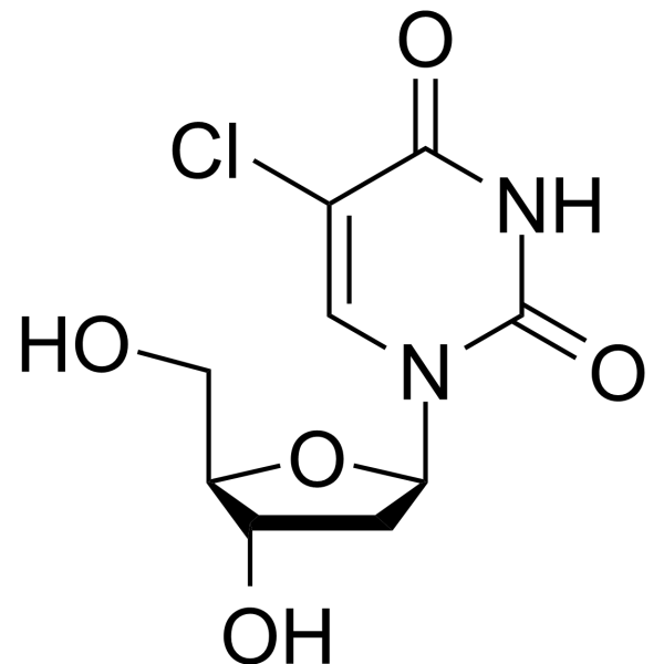 Description5-Chloro-2'-deoxyuridine is a thymine analog. It can be used to study the potential of hypochlorous acid damage to DNA and DNA precursors.(In Vitro):When 5-Chloro-2’-deoxyuridine (ClDU) is placed into the tissue culture medium, mammalian cells incorporate the analog into DNA. It is observed that a 10 μM concentration of 5-Chloro-2’-deoxyuridine in the media does not alter cell division kinetics. Previously it has been shown that 5-Chloro-2’-deoxyuridine is metabolized and incorporated into DNA using antibodies that bind selectively to DNA containing halogenated bases. In the studies reported here, 5-Chloro-2’-deoxyuridine is more similar to BrdU in acting as a T analog. The toxicity of 5-Chloro-2’-deoxyuridine could in part be attributed to inhibition of thymidylate synthase .