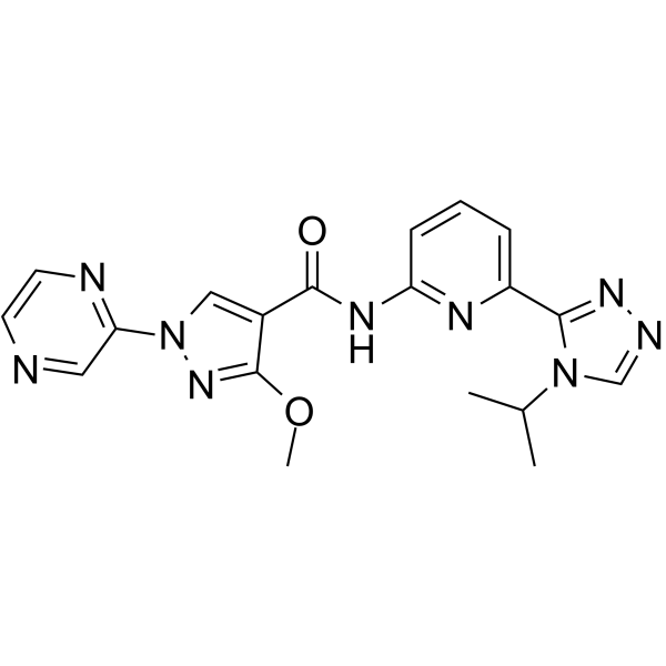 SMILESCC(C)n1c(-c2cccc(NC(c3cn(-c4nccnc4)nc3OC)=O)n2)nnc1