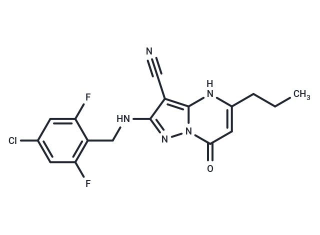 SMILESCCCc1cc(=O)n2nc(NCc3c(F)cc(Cl)cc3F)c(C#N)c2[nH]1