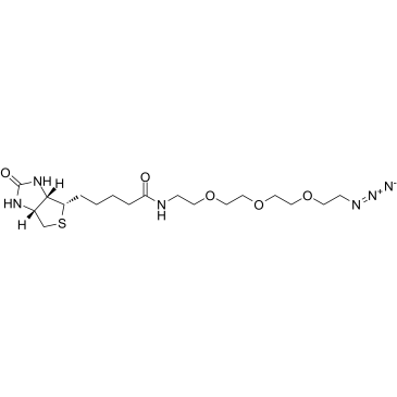 Brief DescriptionBiotin-C2-PEG3-azide is a biotin with the azide tag, it can be conjugated to antiviral inhibitors, for example, RYL-634, which shows excellent broad-spectrum inhibition activity against various pathogenic viruses.