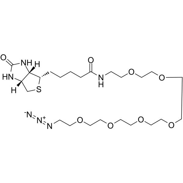 DescriptionBiotin-PEG6-azide is a biotin-labeled, PEG-based PROTAC linker that can be used in the synthesis of PROTACs.(In Vitro):PROTACs contain two different ligands connected by a linker; one is a ligand for an E3 ubiquitin ligase and the other is for the target protein. PROTACs exploit the intracellular ubiquitin-proteasome system to selectively degrade target proteins.