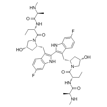 Chemical Name(2S)-N-[(2S)-1-[(2R,4S)-2-[[6-fluoro-2-[6-fluoro-3-[[(2R,4S)-4-hydroxy-1-[(2S)-2-[[(2S)-2-(methylamino)propanoyl]amino]butanoyl]pyrrolidin-2-yl]methyl]-1H-indol-2-yl]-1H-indol-3-yl]methyl]-4-hydroxypyrrolidin-1-yl]-1-oxobutan-2-yl]-2-(methylamino)propanamide