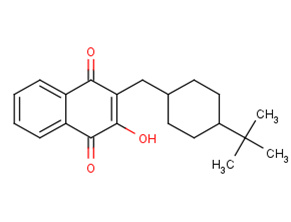 DescriptionBuparvaquone is a hydroxynaphthoquinone antiprotozoal drug related to parvaquone and atovaquone.(In Vitro):In 4-day proliferation assays, buparvaquone efficiently inhibits N.?caninum tachyzoite replication(IC50=4.9?nM; IC100=100?nM). Buparvaquone is significantly selective against L. (L.) infantum chagasi intracellular amastigotes, with an IC50 value of 1.5 μM. Other cutaneous species are also susceptible to buparvaquone, with IC50 values in the range 1-4 μM.(In Vivo):Treatment of N.?caninum infected mice with buparvaquone (100?mg/kg) either by intraperitoneal injection or gavage prevents neosporosis symptoms in 4 out of 6 mice in the intraperitoneally treated group, and in 6 out of 7 mice in the group receiving oral treatment. Both a hydrous gel and water-in-oil emulsion of buparvaquone significantly reduce cutaneous parasite burden and lesion size, compared with the untreated control.