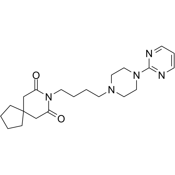 In VivoBuspirone (1-5 mg/kg; i.p. and i.g.; for 5 days; C57BL/6N mice) reduces anxiety/depression behaviors.Buspirone (1-5 mg/kg; i.p. and i.g.; for 5 days; C57BL/6N mice) restores IS-shifted β-diversity in the gut microbiota. Animal Model:Male C57BL/6N mice Dosage:1 and 5 mg/kg Administration:Oral gavage and intraperitoneal injection; for 5 days Result:Reduced TNF-α expression and NF-κB+/Iba1+ cell population in the hippocampus and myeloperoxidase activity and NF-κB+/CD11c+ cell population in the colon.Animal Model:Male C57BL/6N mice Dosage:1 and 5 mg/kg Administration:Oral gavage and intraperitoneal injection; for 5 days Result:Reduced the IS- or EC-induced gut Proteobacteria population.