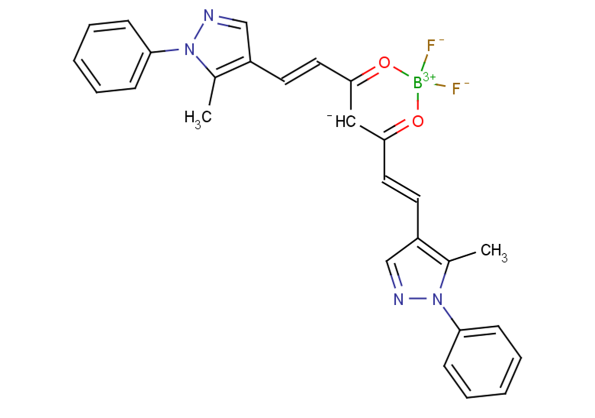 SMILES[F-][B+3]1(O=C(/C=C/C2=C(N(N=C2)C3=CC=CC=C3)C)[CH-]C(/C=C/C4=C(N(N=C4)C5=CC=CC=C5)C)=O1)[F-]