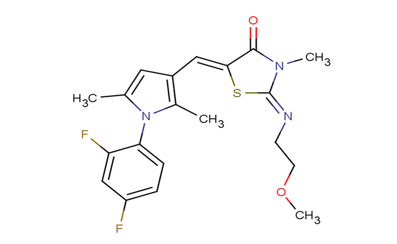 SMILESO=C1N(C)/C(S/C1=C\C2=C(C)N(C3=CC=C(F)C=C3F)C(C)=C2)=N/CCOC