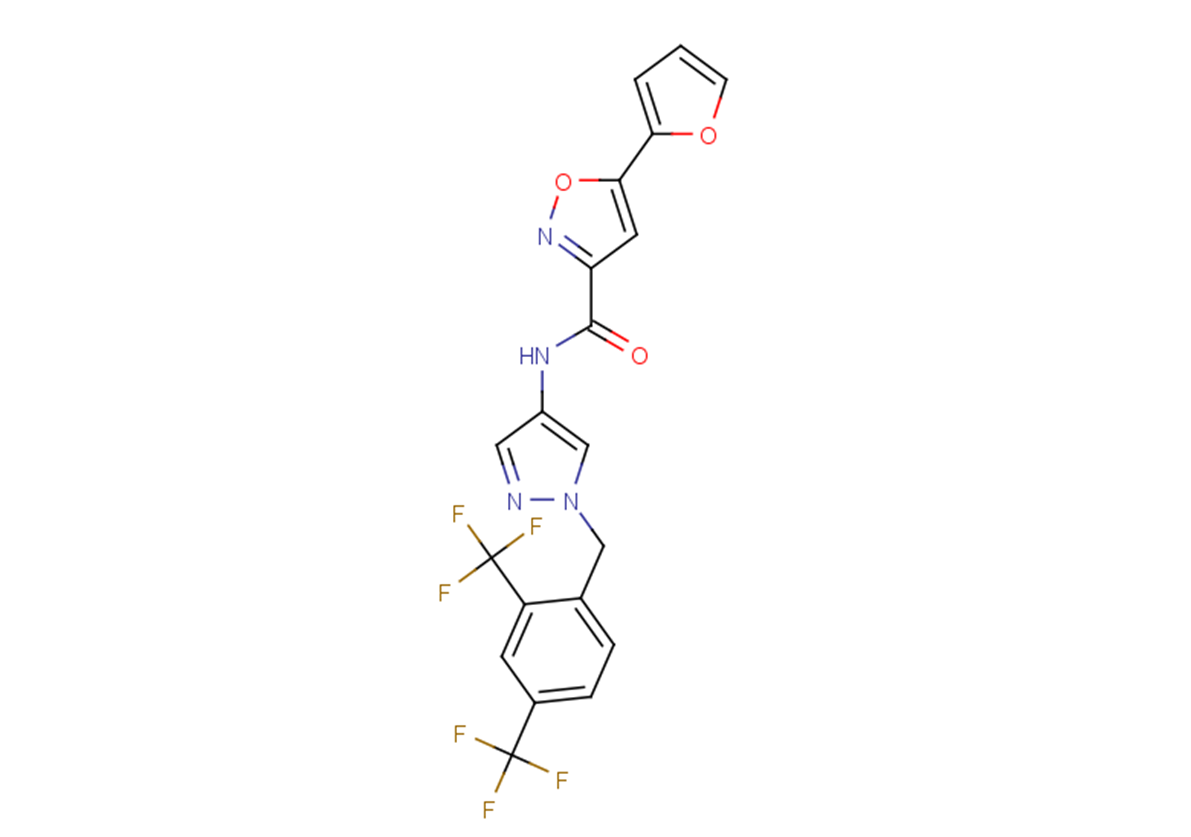 SMILESO=C(NC1=CN(CC2=CC=C(C(F)(F)F)C=C2C(F)(F)F)N=C1)C3=NOC(C4=CC=CO4)=C3
