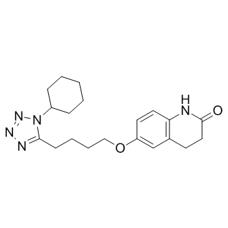 DescriptionCilostazol (OPC 13013, OPC 21) is a potent inhibitor of PDE3A with IC50 of 0.2 uM; inhibits platelet aggregation and has considerable antithrombotic effects in vivo. The compound relaxes vascular smooth muscle and inhibits mitogenesis and migration of vascular smooth muscle cells; also upregulates autophagy via SIRT1 activation, has preventive effects on various central nervous system (CNS) diseases.Stroke Approved(In Vitro):Cilostazol selectively inhibits cGMP-inhibited phosphodiesterase (PDE 3) and is a potent inhibitor of platelet aggregation induced by various agonists.Cilostazol inhibits stress-induced human platelet aggregation (SIPA) dose-dependently, with an IC50 of 15 μM for SIPA, and with a similar IC50 of 12.5 μM for ADP-induced platelet aggregation.Cilostazol directly and effectively inhibits the activation of HSC but not of Kupffer cells.(In Vivo):Cilostazol (clinically used doses; p.o.; for 2 weeks) could alleviate CCl4 -induced hepatic fibrogenesis in vivo, presumably due to its direct effect to suppress HSC activation.Cilostazol (intraperitoneal injection; 10 mg/kg; 7 consecutive days after ischemia) attenuates neurological dysfunctions, brain atrophy and infarct volume, and inhibits astrocyte proliferation/glial scar formation and accelerated the angiogenesis in the ischemic boundary zone 7 and 28 days after ischemia.