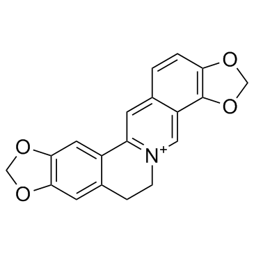 DescriptionCoptisine treatment increases cell viability based on its reversal effect on the enhanced activity of Indoleamine 2, 3-dioxygenase . Coptisine treats myocardial I/R likely through suppressing myocardial apoptosis and inflammation by inhibiting the Rho/ROCK pathway. Coptisine is a potential anti-osteosarcoma drug candidate, via exerting a strong anti-osteosarcoma effect with very low toxicity .Coptisine with a high dosage could inhibit cholesterol synthesis via suppressing the HMGCR expression and promoting the use and excretion of cholesterol via up-regulating LDLR and CYP7A1 expression. Coptisine suppresses adhesion, migration and invasion of MDA-MB-231 breast cancer cells in vitro, the down-regulation of MMP-9 in combination with the increase of TIMP-1 possibly contributing to the anti-metastatic function for breast cancer.