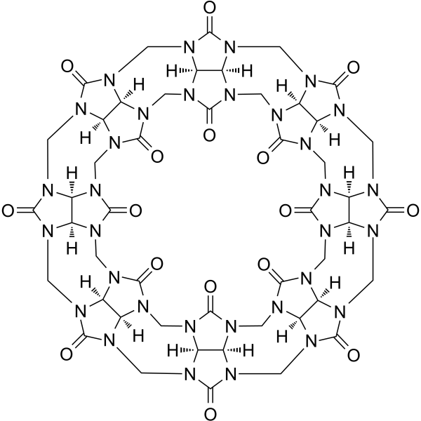 In VitroCucurbituril (0~20 μM; 48 hours; CHO-K1 cells) makes the relative cell viability dropped marginally to 86%.Cucurbituril indeed selectively induces the heterodimerization of MV–eYFP with Np–eCFP. Cucurbituril-induced high energy transfer between the proteins is only observed in the presence of all three supramolecular components, allowing the formation of the ternary complex. In the presence of Cucurbituril, the unspecific protein assembly induced by the methylviologen is inhibited. The ternary system of Cucurbituril with methylviologen (MV) and naphthalene (NP) can also be successfully used for the formation of selective protein heterodimers of more hydrophobic proteins.The presence of Cucurbituril as a host molecule is required to prevent MV induced unspecific dimerization with hydrophobic protein surfaces. Cell Viability Assay Cell Line:CHO-K1 cells Concentration:0~20 μM Incubation Time:48 hours Result:At the highest investigated concentration of 20 μM after 48 h, the relative cell viability dropped marginally to 86%.