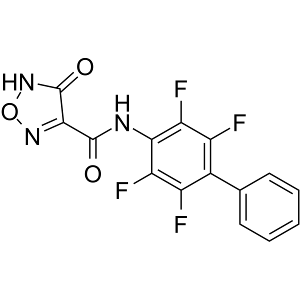 DescriptionDHODH-IN-14 is an analog of hydroxyfuran pyrimidine A771726. DHODH-IN-14 is a dihydroorotate dehydrogenase (DHODH) inhibitor IC50 0.49 μM mouse liver DHODH. DHODH-IN-14 can be used for rheumatoid arthritis.(In Vitro):DHODH-IN-14 is a hydroxyfuran analog of A771726, which contains a biphenyl scaffold with a fluorine substituent. Turning to the derivative DHODH-IN-14, no major differences were observed between the poses obtained on 1UUO and 1D3G. In both cases, it was found that DHODH-IN-14 was bound in a BQN-like manner, that is, the deprotonated hydroxyfuran part faced Arg136, thus effectively mimicking the carboxyl groups of BQN and related compounds. Although it was not found on 1D3G and 1UUO that hydroxyfuran interacted with Tyr356 in a similar way to leflunomide, when 2BXV was used as a docking target, a large portion of such postures were found.