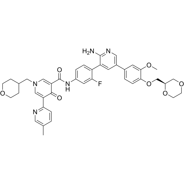 DescriptionDS-1205 is a potent and selective inhibitor of AXL kinase, with an IC50 of 1.3 nM. DS-1205 also inhibits MER, MET, and TRKA, with IC50s of 63, 104, and 407 nM, respectively. DS-1205 can inhibit cell migration in vitro and tumor growth in vivo.(In Vitro):DS-1205 (0.3-33 μM; 2-24 h) inhibits hGAS6-induced migration in NIH3T3-AXL cells (EC50=2.7 nM). DS-1205 (1-10000 μM; 2-24 h) significantly inhibits the phosphorylation of AXL in NIH3T3-AXL cells. DS-1205 decreases NIH3T3 cell proliferation but not obviously inhibits growth (GI50>10,000 nM).(In Vivo):DS-1205 (3.1-50 mg/kg; p.o. bid for 5 d) exhibits pAXL inhibition mediated antitumor effects in mice.