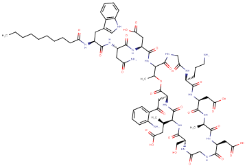SMILESO=C1NCC(N[C@@H](CCCN)C(N[C@@H](CC(O)=O)C(N[C@H](C)C(N[C@@H](CC(O)=O)C(NCC(N[C@H](CO)C(N[C@@H]([C@H](C)CC(O)=O)C(N[C@@H](CC(C2=CC=CC=C2N)=O)C(OC(C)C1NC([C@@H](NC([C@@H](NC([C@@H](NC(CCCCCCCCC)=O)CC3=CNC4=C3C=CC=C4)=O)CC(N)=O)=O)CC(O)=O)=O)=O)=O)=O)=O)=O)=O)=O)=O)=O
