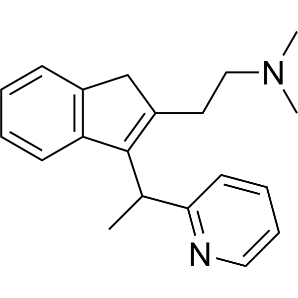 DescriptionDimethylbutyl is an antihistamine/anticholinergic drug. It is administered orally and used to relieve itching locally.(In Vitro):In follicle-enclosed Xenopus oocytes, Dimethindene (5-500 μM) decreases Cromakalim cromakalim-induced K+ currents (IC50 = 29.5 μM).(In Vivo):In C57BL/6 mice with skin wound healing, Dimethindene (0.25 mg; i.p.) impairs cutaneous wound healing and delays skin wound closure.