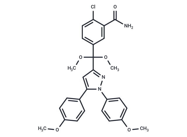 SMILESO=C(N)C1=CC(=CC=C1Cl)C(OC)(OC)C2=NN(C3=CC=C(OC)C=C3)C(=C2)C=4C=CC(OC)=CC4