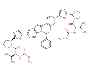 SMILESCOC(=O)N[C@@H](C(C)C)C(=O)N1CCC[C@H]1C1N=CC(=N1)c1ccc2n3[C@@H](Oc4cc(ccc4-c3cc2c1)C1C=NC(=N1)[C@@H]1CCCN1C(=O)[C@@H](NC(=O)OC)C(C)C)c1ccccc1