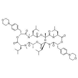 SMILESO=C([C@H](CC(C)C)N(C)C([C@@H](C)OC([C@H](CC(C)C)N(C)C([C@@H](CC1=CC=C(N2CCOCC2)C=C1)OC([C@H](CC(C)C)N(C)C([C@@H](C)OC([C@H](CC(C)C)N3C)=O)=O)=O)=O)=O)=O)O[C@H](CC4=CC=C(N5CCOCC5)C=C4)C3=O