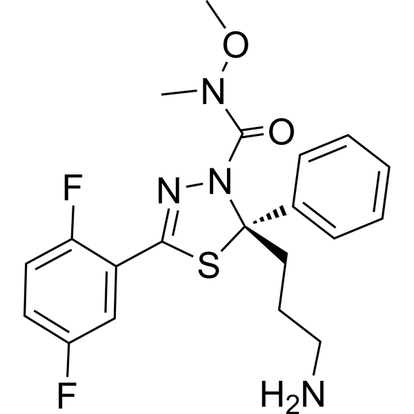In VitroFilanesib induces mitotic arrest in multiple cell lines.Filanesib exhibits anti-proliferative against a broad range of human and rodent tumor cell lines, including a variety of leukemias and solid tumors, with EC50s between 0.4 nM and 14.4 nM.Filanesib (0.001-0.1 nM; 36 hours) induces apoptosis in a dose-dependent manner in HeLa cells.Filanesib (3.13-6.25 nM; 44 hours) causes accumulation of cells in the G2/M phase of the cell cycle in a dose-dependent manner in HeLa cells.Filanesib potently induces cell cycle block and subsequent death in leukemic cells via the mitochondrial pathway and has potential to eradicate AML progenitor cells.Filanesib (3 μM; 6-24 hours) is able to induce caspase-2 activation.Filanesib (0.003-3 μM; 24-48 hours) is cytotoxic in Type II EOC cells. Apoptosis Analysis Cell Line:Hela cells Concentration:0.01-0.1 nM Incubation Time:36 hours Result:Induced the formation of nucleosomes and activation of caspases-3 and 7.Cell Cycle Analysis Cell Line:HeLa cells Concentration:0.78 nM, 1.56 nM, 3.13 nM, 6.25 nM Incubation Time:44 hours Result:Resulted in G2/M arrest.Western Blot Analysis Cell Line:Type II EOC cells Concentration:3 μM Incubation Time:6 hours, 12 hours, 24 hoursResult:Induced caspase-2 activation in a time-dependent manner.Cell Cytotoxicity Assay Cell Line:Type II EOC cell lines (A2780, CP70, 01-28)Concentration:0.003 μM, 0.03 μM, 0.3μM, 3 μM Incubation Time:24 hours , 48 hours Result:Effectively decreased cell viability in a time-dependent manner in the Type II EOC cell lines.