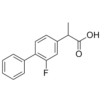 DescriptionA non-steroidal anti-inflammatory drug (NSAID); primarily indicated as a pre-operative anti-miotic as well as orally for arthritis or dental pain; cyclooxygenase (COX) inhibitor.Pain Approved(In Vitro):Flurbiprofen (2-20 nM; 12-48 hours) significantly decreases SW620 cells proliferation in a concentration- and time-dependent manner.Flurbiprofen (10 nM; 24 hours) decreases COX-2 expression.Flurbiprofen (10 nM; 24 hours) inhibits the expression of inflammatory factors by inhibiting COX-2.Flurbiprofen (10 nM; 24 hours) promotes the apoptosis of colorectal cancer cells by inhibiting COX-2.(In Vivo):Flurbiprofen (0.3-4.8 mg/kg; p.o.; 4-5 dosages) has acute anti-inflammatory in adrenalectomized rats.Flurbiprofen (10 mg/kg; i.p.; daily; for 6 days) attenuates high-fat diet-induced obesity in mice.