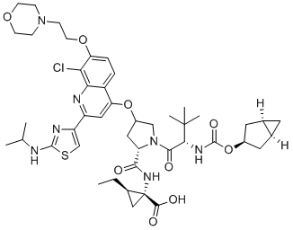 SMILESCCC1CC1(C(=O)O)NC(=O)C2CC(CN2C(=O)C(C(C)(C)C)NC(=O)OC3CC4CC4C3)OC5=CC(=NC6=C5C=CC(=C6Cl)OCCN7CCOCC7)C8=CSC(=N8)NC(C)C